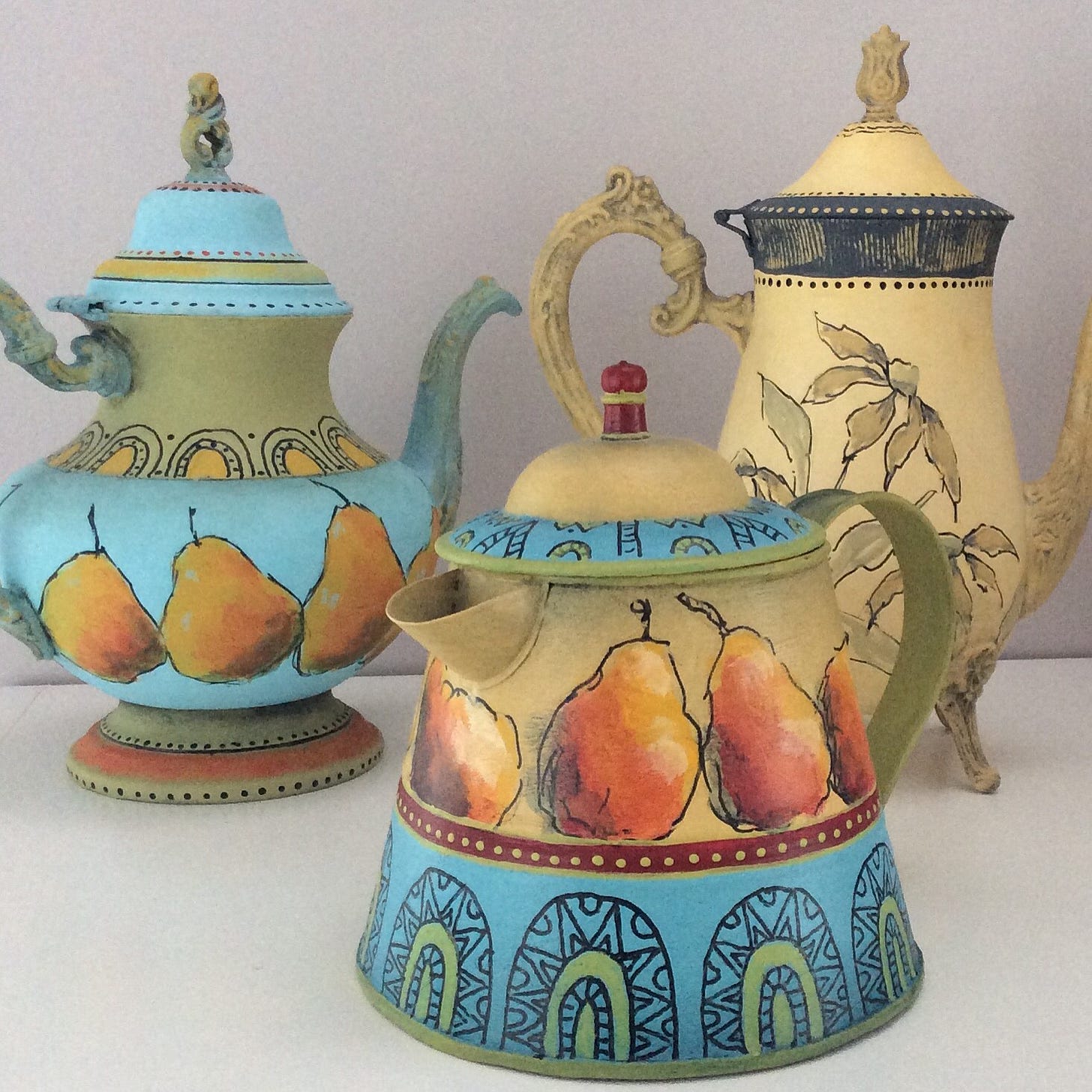 And finally, these metal coffee pots are pure decorative joy. I painted these with repeated images and patterns that weren’t meant to offer any particular compositional ideas, but merely for the fun of seeing what repeated lines and shapes can add to a three-dimensional surface.