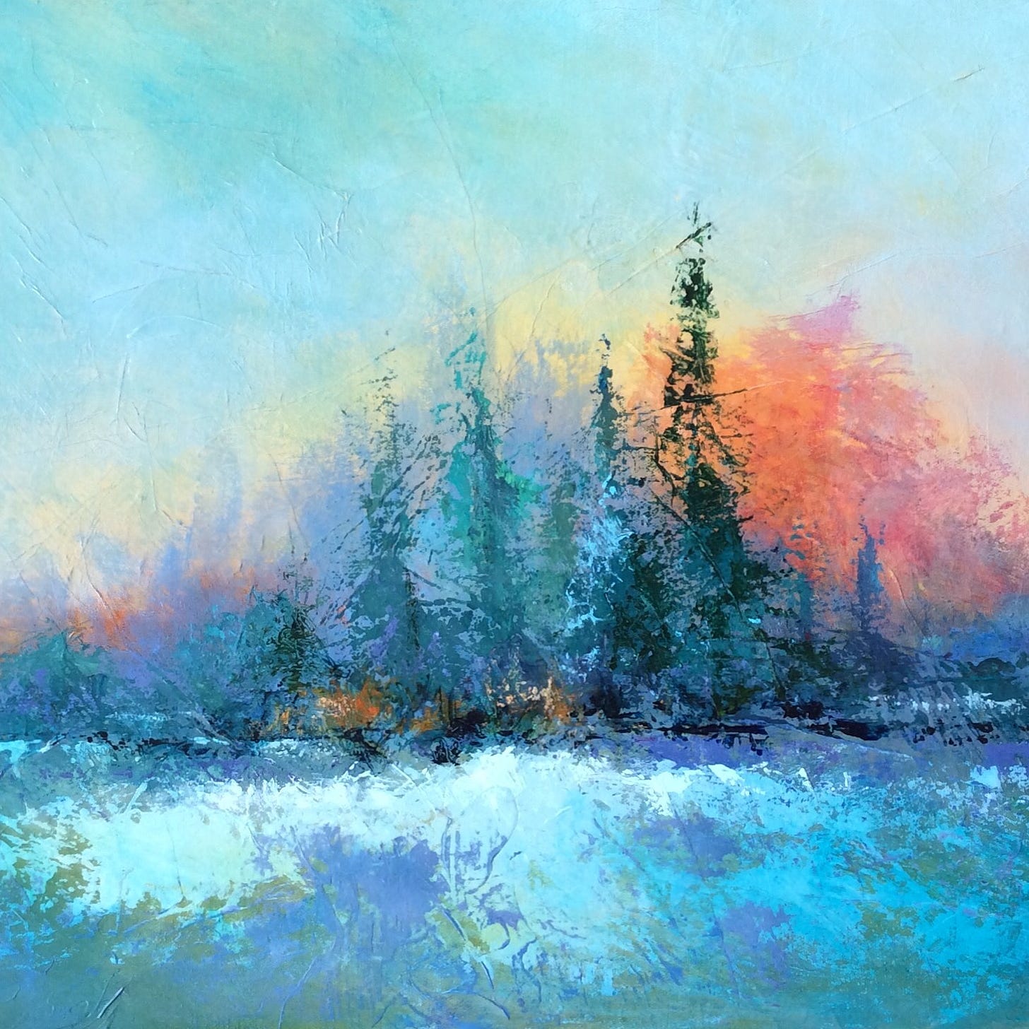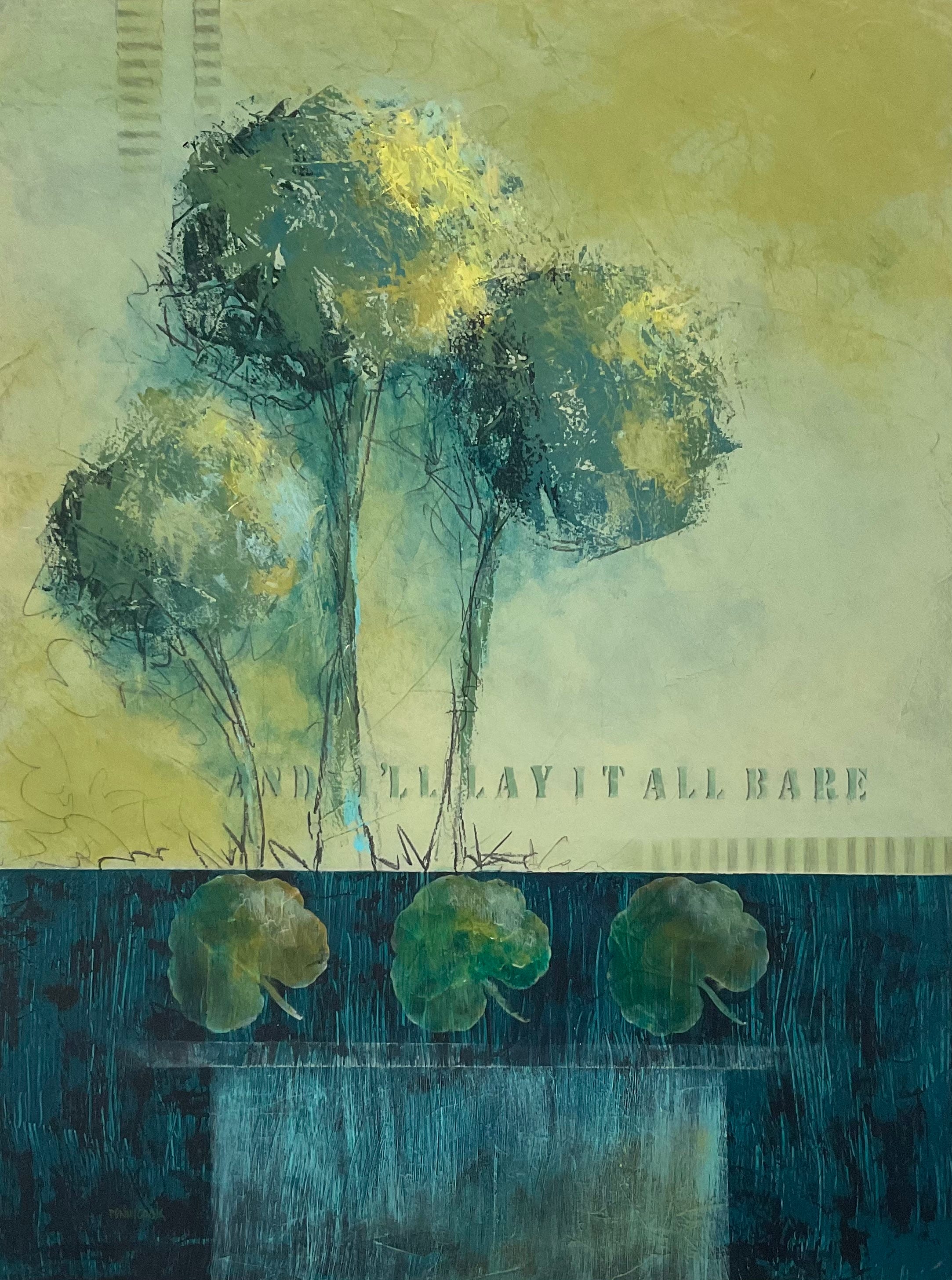 The painting above is a combination of repetition and pattern. The trees at the top of the painting are similar yet have their differences. The leaves on the table are pure mechanical repetition or pattern. The trees and the scraggly graphite lines show movement as do the short vertical and horizontal lines at the top and middle of the image. These short bars of colour are repetitive pattern but they, as well as the vertical lines in the blue section, provide a sense of rhythm to the piece.