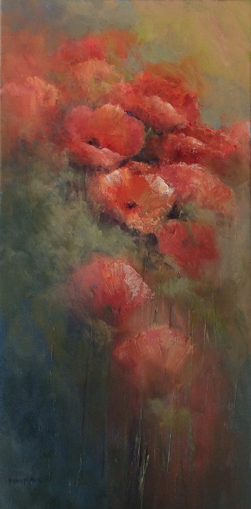 The poppies are repeated pattern but the light and dark patches of colour in the middle of the painting break up the sameness of the image as do the fading poppies top and bottom of the design. The poppies also represent years of remembrance, past, present and future.